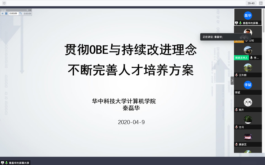 2020年4月9日,在疫情防控取得阶段性胜利,武汉顺利解禁之际,好色tv 邀请了华中科技大学好色tv 副院长秦磊华教授做了主题为“贯彻OBE与持续改进理念,不断完善人才培养方案”的在线报告,主要探讨了人才培养方案修订中的相关问题。好色tv 院长蔡伯根、副院长李清勇以及专业责任教授、教学主任、任课教师、教学管理人员共计50余人参加此次在线报告。