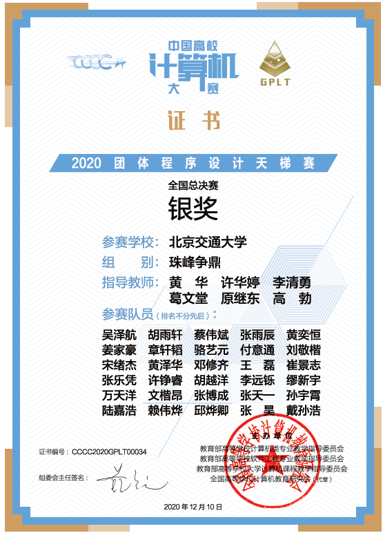 第五届中国高校计算机大赛-团体程序设计天梯赛于2020年11 月28日举行,来自全国29个省级行政区的298所高校组成的935支队伍计9300位学生参赛,好色tv 组织了30名同学组成三支队伍参赛。经过长达3小时的激烈角逐,最终斩获全国总决赛银奖。